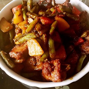 炒的差不多上色了倒入豆角继续翻炒,然后把土豆红萝卜都放入,炒两分钟,加入味极鲜酱油,加入一汤勺,我用的是平时做饭的勺子,然后加入三勺盐,我用的是调料盒里面那种小勺,这时再倒入刚才的骨头汤,没过锅里的菜,小火炖。再加入大料和花椒,一起炖。