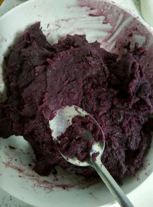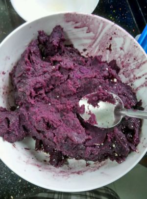 紫薯切丁隔水蒸熟,用勺子按压成泥状