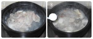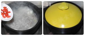 7. 把羊肉片放进去,小火煮10分钟。羊肉片放的过早,肉质会变老,不鲜嫩(如果是羊肉块的话,要先炖羊肉,羊肉炖至快熟,再放山药,防止山药煮烂)。