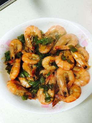 放入虾,放料酒,生抽,炒。然后放入水,煮一会…再放入刚才的青椒,一起煮一会,放糖,少许盐,到汁收的差不多的时候,就搞定了。