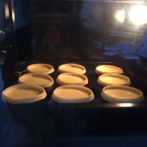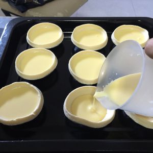 准备9个挞皮,慢慢倒入挞液,每一个倒入8分满即可。这蛋挞方子一次刚好可以做9个蛋挞,一次烤完,绝不浪费!