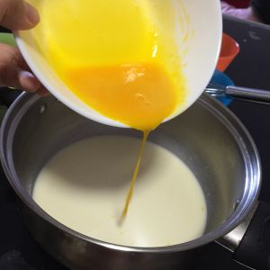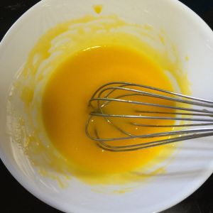 将打撒的蛋黄慢慢加入刚刚晾凉的材料中,边慢慢倒入边搅动,直至蛋黄充分溶解在材料中!