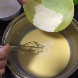加入面粉,同样是边慢慢加入,边搅拌!Ps:面粉一定要慢慢筛入液体材料中,不然液体中会结出小面疙瘩不易搅拌均匀。北妈这次准备材料时筛了面粉,加入时就没有过筛,结果导致液体中有好多小面疙瘩,特别不易搅拌开。偷懒是万万不行的!