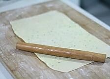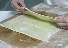 将经过两次四折的面皮擀开,擀成0.2cm厚的长方形;