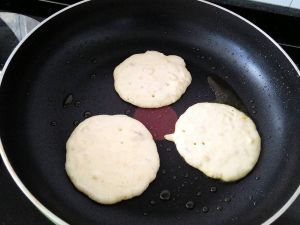 用汤勺盛玉米糊,摊成小圆饼,摊大饼没法翻面。待表面快要凝固间翻面煎另一面,煎好盛出。整个过程中小火