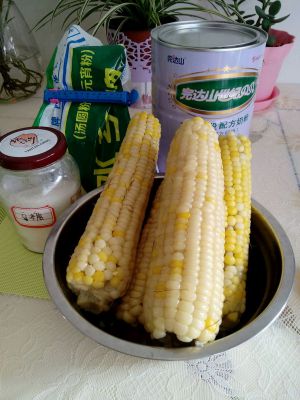 煮熟的糯玉米,糖,奶粉,元宵粉(后来改用面粉了)