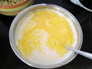 将玉米糊糊倒到盆里,将蛋液倒入,加入糯米粉(其实应该加面粉的)