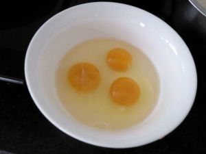 为添加营养和口感,又添加3个土鸡蛋,打散备用