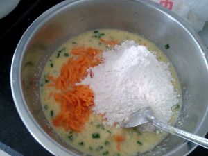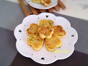 剩下的一半加葱花,胡萝卜碎(事先用盐腌下),加入面粉拌匀。这是改良款的,用模具小火煎好