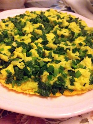 将平底锅放少许油 把玉米面平铺锅底 再把搅拌好的韭菜鸡蛋平铺玉米面上边 开中火 闷五分钟 关火 出锅