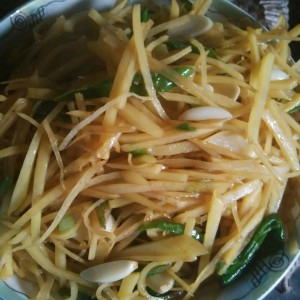 做这道菜要一直大火。放葱辣椒,出香味放土豆丝翻炒。