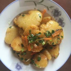 将土豆推到锅边,下葱白,熬葱油。然后再入少量的生抽,盐,孜然粉,翻炒。