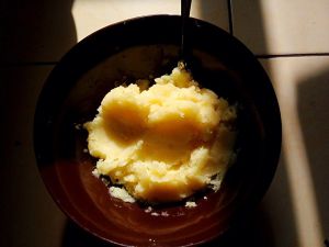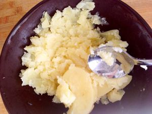 土豆捣烂。我习惯于用勺子背面碾碎,也可以借助菜刀或者擀面杖。