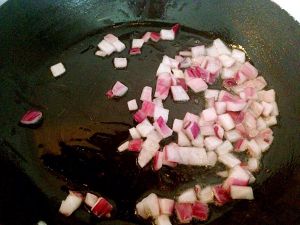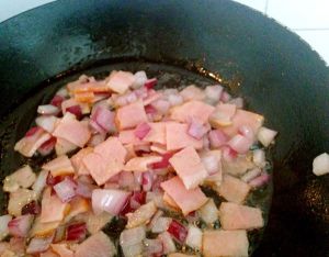 锅里放点油,不用太多,培根也会出油。先放洋葱,中小火炒香~