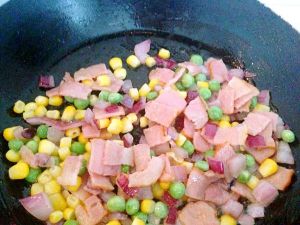 加入青豆和玉米粒,炒到蔬菜表面起皱。加入适量盐和糖调味。如果还要焗的话不用炒熟。