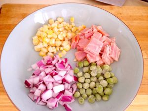 蒸土豆的时候准备其他食材。洋葱、培根切丁,青豆、玉米粒洗干净。
