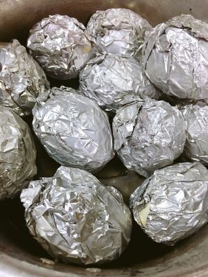 塞好米饭的咸蛋包上锡纸放进蒸锅大火蒸至熟透(这过程大概25~30分钟左右,根据自己的实际情况调整)
