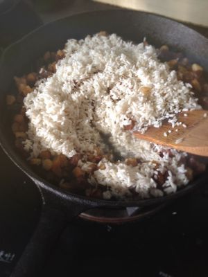 热油锅放馅料炒香后加入糯米、黑胡椒、酱油翻炒均匀(咸蛋本身有咸味所以不用放盐,馅料也可以根据自己的喜好加入各种馅料哟)