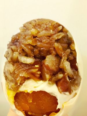 加入泡馅料的水中火炒至五成熟盖盖用铁锅的余温焖煮五分钟。趁焖饭的时间准备咸鸭蛋,咸鸭蛋洗干净开小口到出蛋白后把半数的糯米饭塞进去