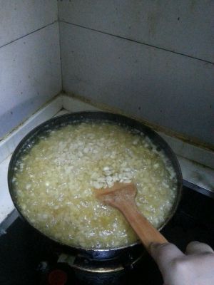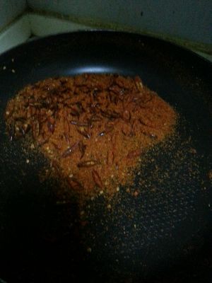 加入辣椒粉和花椒粉拌炒,始终保持中小火