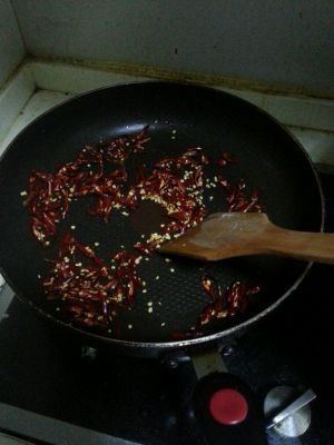 另取锅加入少量油(我的是用这个锅炸的,就利用残留的油)将干辣椒丝倒入炒香