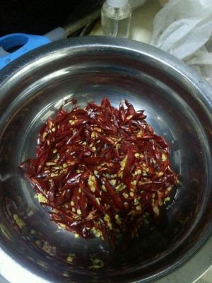 将洗干净的干辣椒用剪刀剪成细条,籽尽量去掉