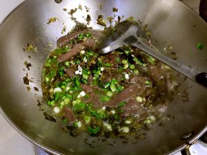 烧至鸭血全部变色熟透了下大蒜叶,盐、鸡精、勾芡起锅