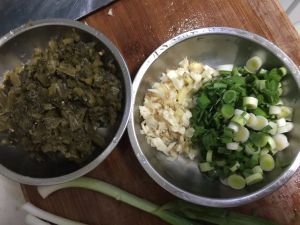 准备调料,酸菜切碎,姜蒜切粒,小葱切花,有大蒜叶最好也切花