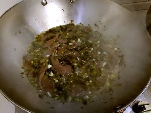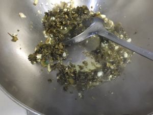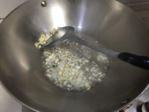 冷锅冷油下姜蒜粒炒香