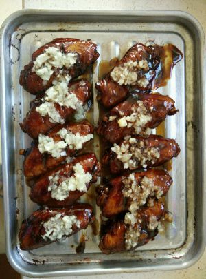 将烤盘抹油,或铺锡纸,摆好鸡翅,把剩下的炖汤浇在鸡翅上,将蒜蓉水均匀的堆在鸡翅上