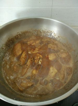 加入老抽,生抽,和盐,调成又咸又甜的味道,小火炖煮,慢慢收汁,注意别糊锅