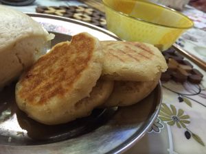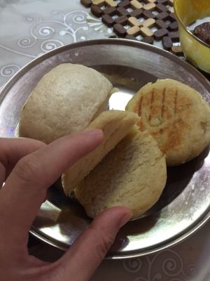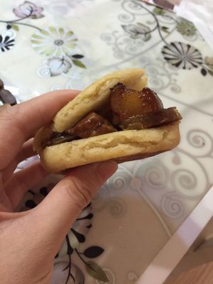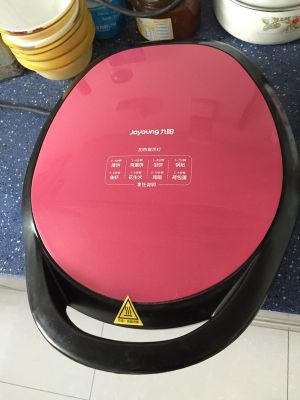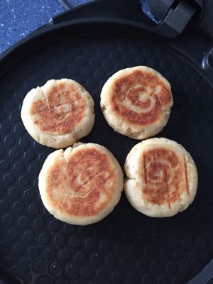 白白胖胖的饼坯放进去烙制,定型后加盖,电饼铛边缘有水蒸气飘出来就差不多了。铲子轻轻按压可以弹起就是熟了。
