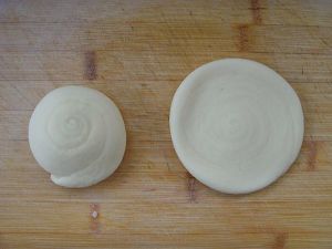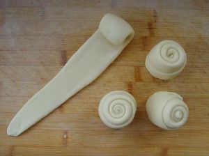 下大小合适的剂子,擀成长条形,从一端开始卷起,立放,醒制。