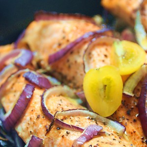 材料准备:三文鱼块、芝加哥牛排调料、切好的洋葱。