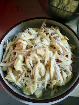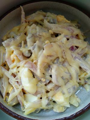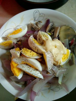 口蘑煮熟捞出,洋葱焯水,水煮鸡蛋切好,加人黑胡椒碎、沙拉酱