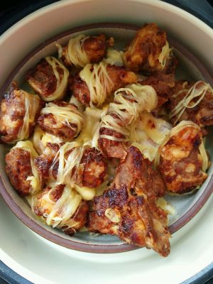排骨根据个人烤箱操作放烤箱烤好,烤得表面焦黄就可以了,隔水融化芝士,筷子把芝士裹上烤好的排骨上