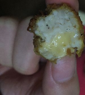 我用的肉不多,一片芝士就够了,我是把芝士切成半厘米大小的片状和肉泥拌匀,放椒盐与食用盐,放一点点淀粉和一勺水搅匀,打一个鸡蛋做蛋液,搅拌好的肉泥滚一遍蛋液,放入面包糠滚一滚,锅里油滚烫后放入裹了面包糠的肉泥,大火一分钟转中火5分钟,时间太久肉就不嫩了