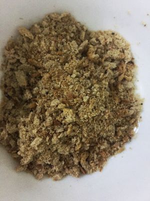 没买到面包糠,买了一份原麦土司,颜色比较深,回家取两切条,放烤箱,100度中火烤10分钟改60度低火烤8分钟,每个人的烤箱不一样,自己琢磨,烤干水分拿出来碾碎,没有擀面杖,就手指捏的