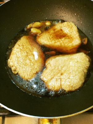 两面都煎好后调入盐,料酒,生抽和老抽,时不时翻面上色。