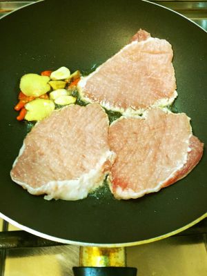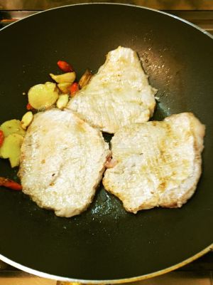 冒出香味后移到一边,放入猪排。