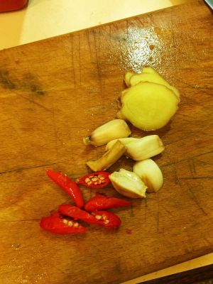 姜切片,蒜切小块,小尖椒切段。