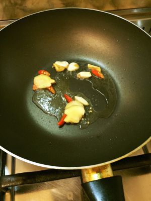 锅中热油,放入姜蒜尖椒爆香。