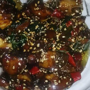 最好大火收汁,挂糖关火,撒上少许白芝麻及刚刚炼油备用的脆薄荷,干辣椒(后者自选,因为偶是四川人,你懂的)!