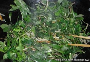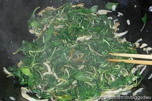 热锅热油快速划炒马兰头和金菇幼笋,倒少量白酒增香。(开车也可吃此菜,只是少量酒而以)