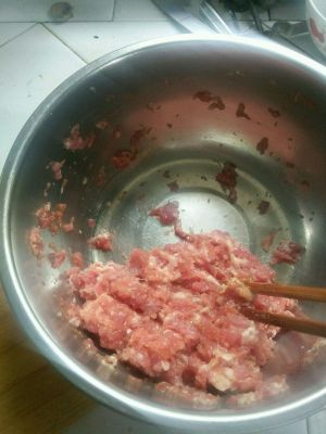 五花肉切成肉末,生姜用磨姜器磨成姜末,把姜末,盐,白糖,料酒,鸡精,味极鲜酱油加入到肉末里面调味,搅拌均匀。