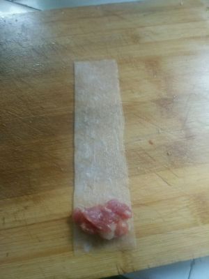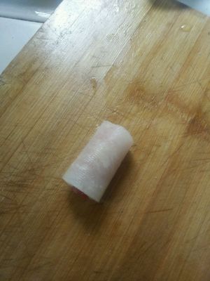 从放肉末的这一端开始卷起,卷成萝卜卷!