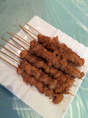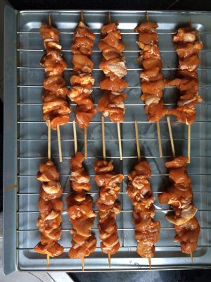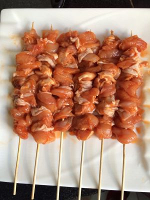竹签洗净,把浆好的鸡肉串成串,不要挤的太紧,不容易熟的