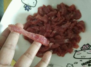 牛肉切条,加盐,料酒,白胡椒粉,淀粉,煨一会。