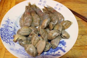 大虾去虾线,花蛤吐清沙后反复清洗·备用··