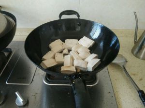 锅热了之后倒油,油可以多一点,油热之后将豆腐切成长条放入锅中。